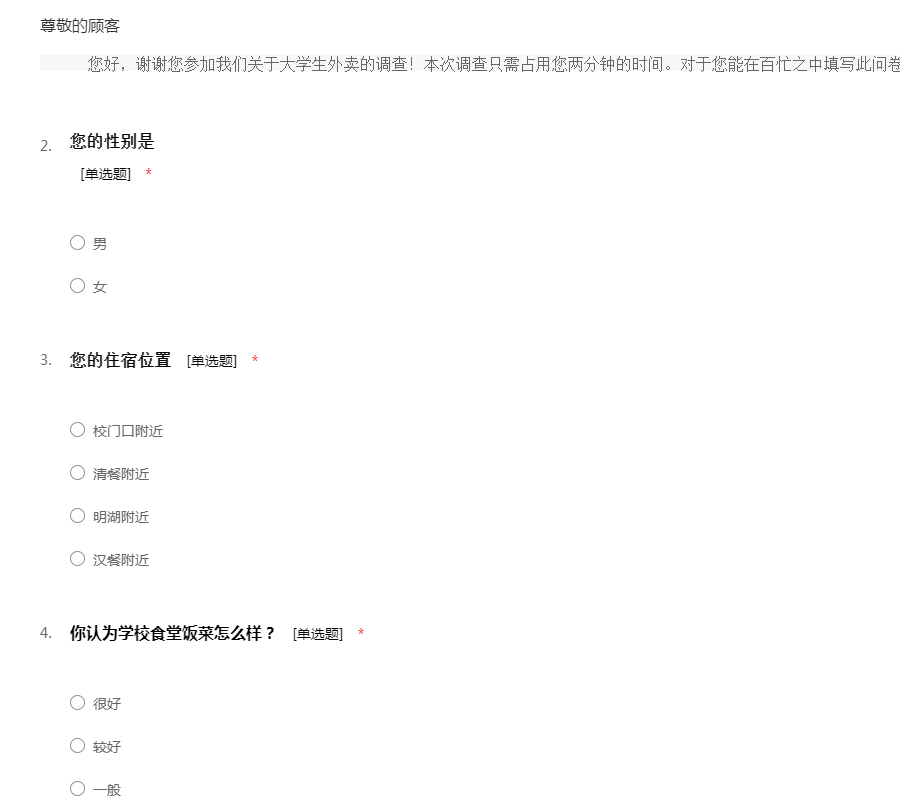 您好,谢谢您参加我们关于大学生外卖的调查!本次调查只需占用您两分钟的时间。对于您能在百忙之中填写此问卷再次表示感谢!