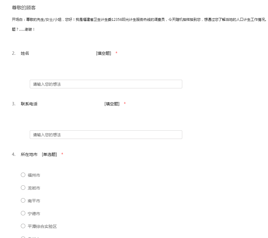 开场白:尊敬的先生/女士/小姐,您好!我是福建省卫生计生委12356阳光计生服务热线的调查员,今天随机抽样抽到您,想通过您了解当地的人口计生工作情况。能否耽误您两分钟时间回答几个简单的问题?……谢谢!