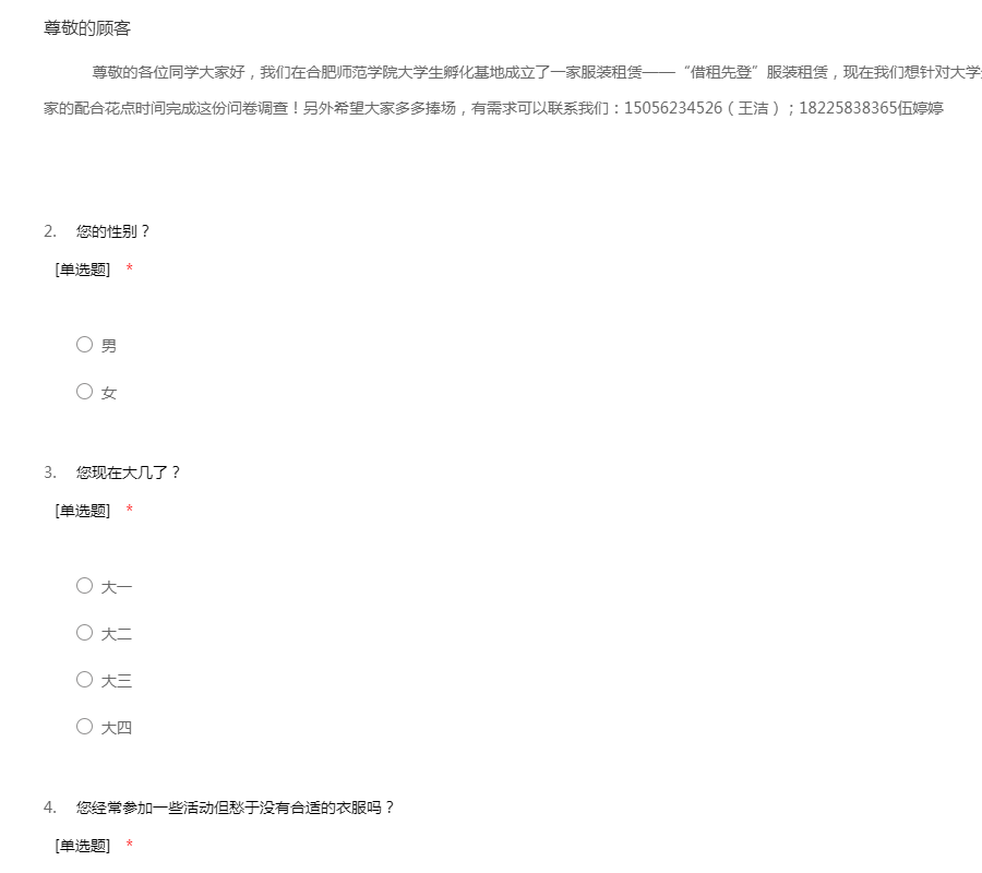 尊敬的各位同学大家好,我们在合肥师范学院大学生孵化基地成立了一家服装租赁——“借租先登”服装租赁,现在我们想针对大学生对租赁服装的需求做一些调查,感谢大家的配合花点时间完成这份问卷调查!另外希望大家多多捧场,有需求可以联系我们:15056234526(王洁);18225838365伍婷婷
