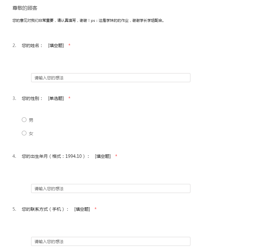 您的意见对我们非常重要,请认真填写,谢谢!ps:这是学妹的的作业,谢谢学长学姐配合。