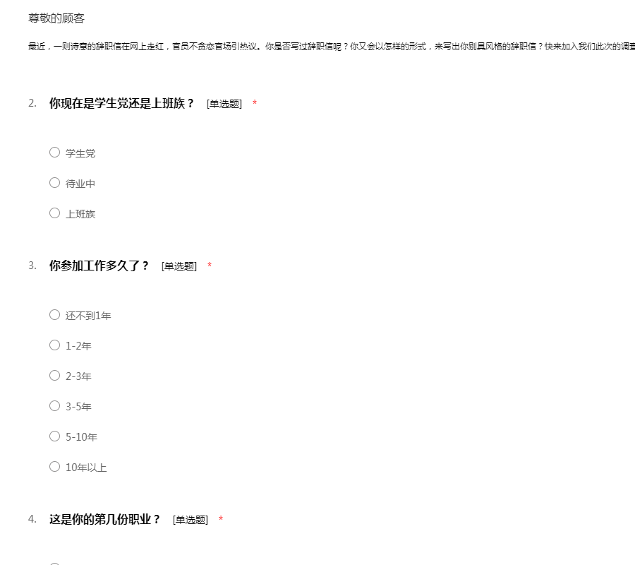 最近,一则诗意的辞职信在网上走红,官员不贪恋官场引热议。你是否写过辞职信呢?你又会以怎样的形式,来写出你别具风格的辞职信?快来加入我们此次的调查问卷,把你的看法留下吧!
