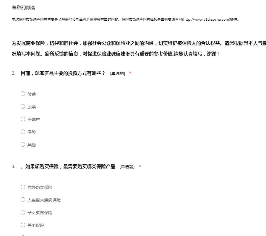 本次保险市场调查问卷主要是了解保险公司品牌及保费等方面的问题。保险市场调查问卷模板是由我要调查网(http://www.51diaocha.com)提供。