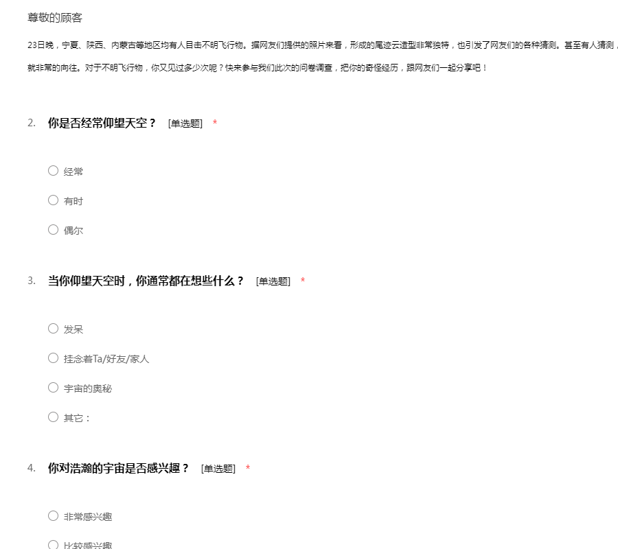23日晚,宁夏、陕西、内蒙古等地区均有人目击不明飞行物。据网友们提供的照片来看,形成的尾迹云造型非常独特,也引发了网友们的各种猜测。甚至有人猜测,这可能是反导试验。对于填空,人们自古以来就非常的向往。对于不明飞行物,你又见过多少次呢?快来参与我们此次的问卷调查,把你的奇怪经历,跟网友们一起分享吧!