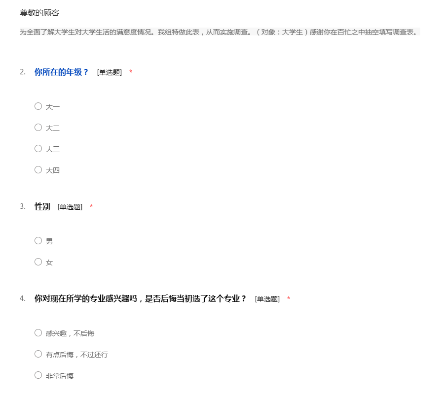 为全面了解大学生对大学生活的满意度情况。我组特做此表,从而实施调查。(对象:大学生)感谢你在百忙之中抽空填写调查表。
