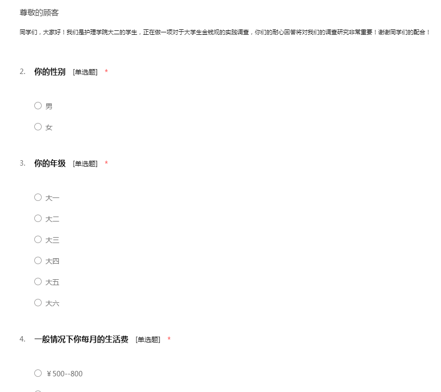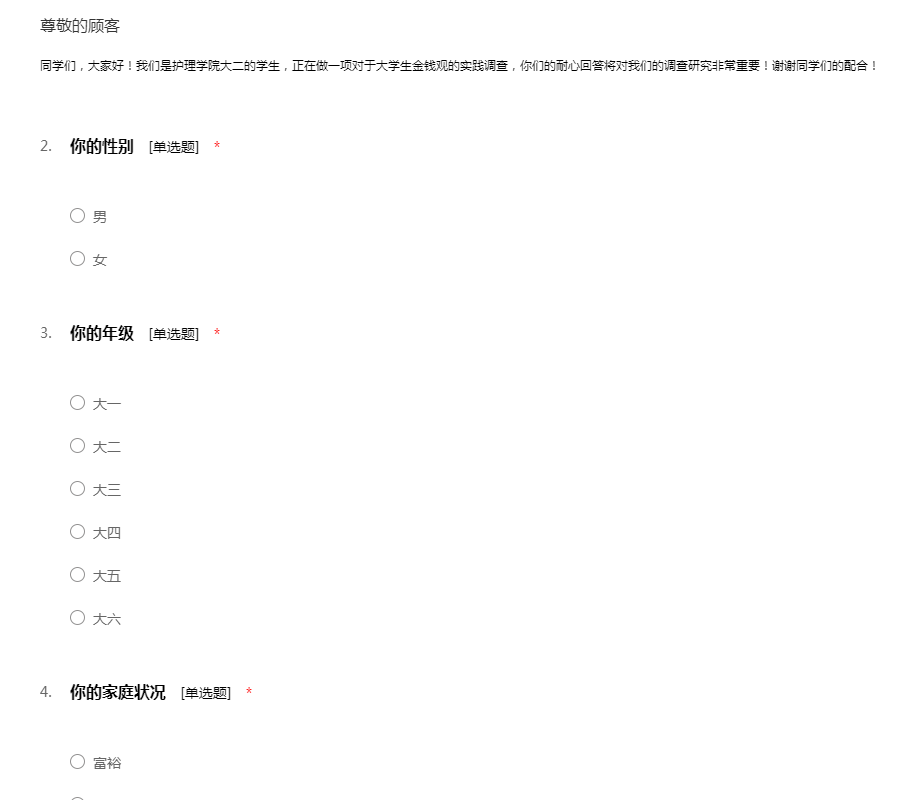 同学们,大家好!我们是护理学院大二的学生,正在做一项对于大学生金钱观的实践调查,你们的耐心回答将对我们的调查研究非常重要!谢谢同学们的配合!