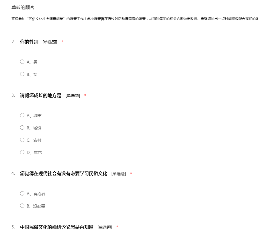 欢迎参加“民俗文化社会调查问卷”的调查工作!此次调查旨在通过对活动满意度的调查,从而对集团的相关方面做出改进。希望您抽出一点时间积极配合我们的调查工作,谢谢您的参与。