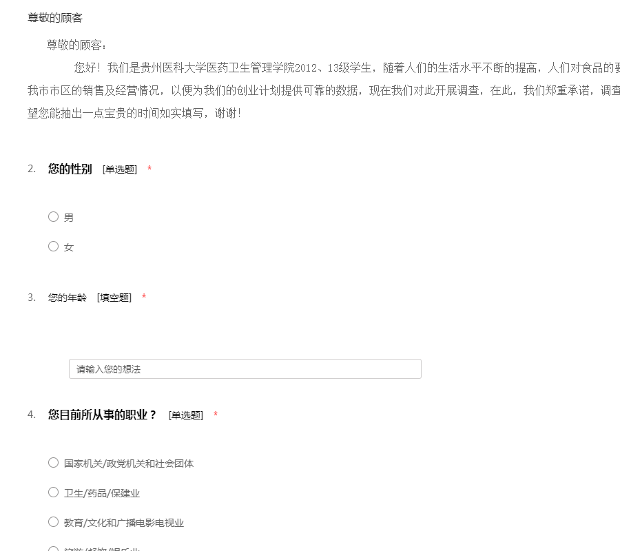 尊敬的顾客: 您好!我们是贵州医科大学医药卫生管理学院2012、13级学生,随着人们的生活水平不断的提高,人们对食品的要求越来越高,为了了解烘焙产品在我市市区的销售及经营情况,以便为我们的创业计划提供可靠的数据,现在我们对此开展调查,在此,我们郑重承诺,调查结果仅供研究使用,结果保密,希望您能抽出一点宝贵的时间如实填写,谢谢!
