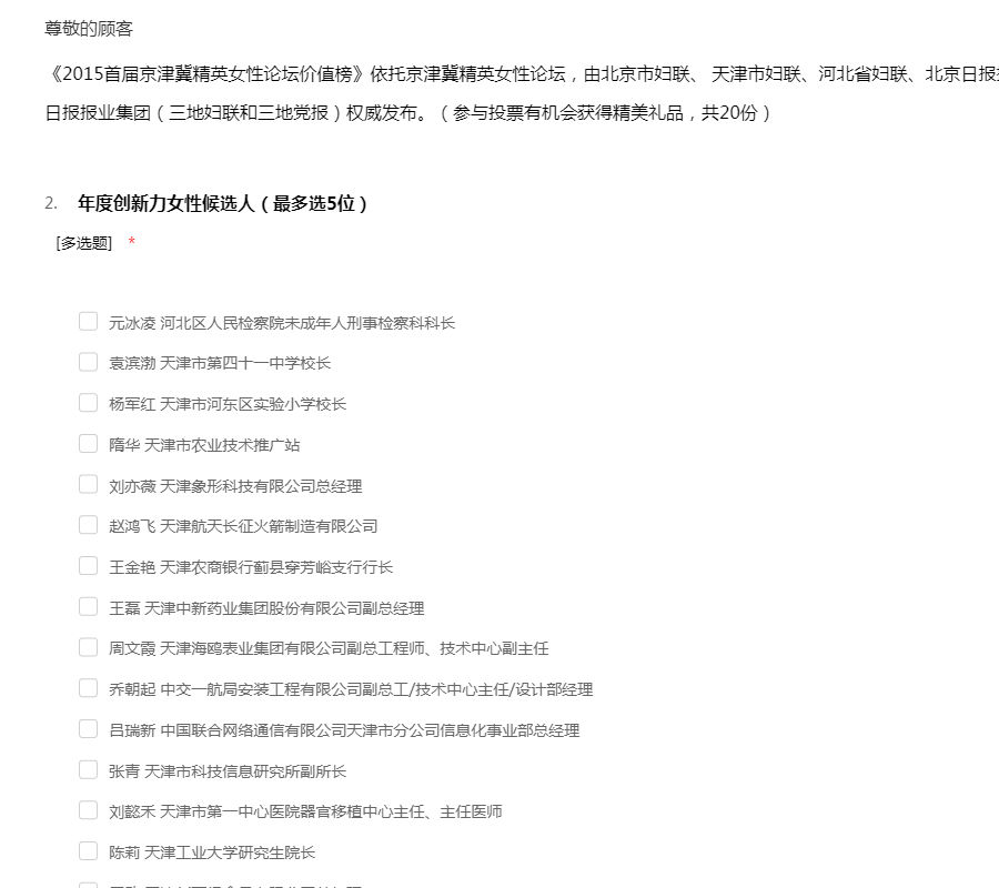 《2015首届京津冀精英女性论坛价值榜》依托京津冀精英女性论坛,由北京市妇联、 天津市妇联、河北省妇联、北京日报报业集团、天津日报传媒集团、河北日报报业集团(三地妇联和三地党报)权威发布。(参与投票有机会获得精美礼品,共20份)