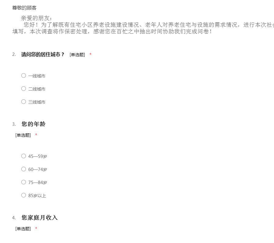 亲爱的朋友: 您好!为了解既有住宅小区养老设施建设情况、老年人对养老住宅与设施的需求情况,进行本次社会调查。请根据您的实际情况填写,本次调查将作保密处理,感谢您在百忙之中抽出时间协助我们完成问卷!