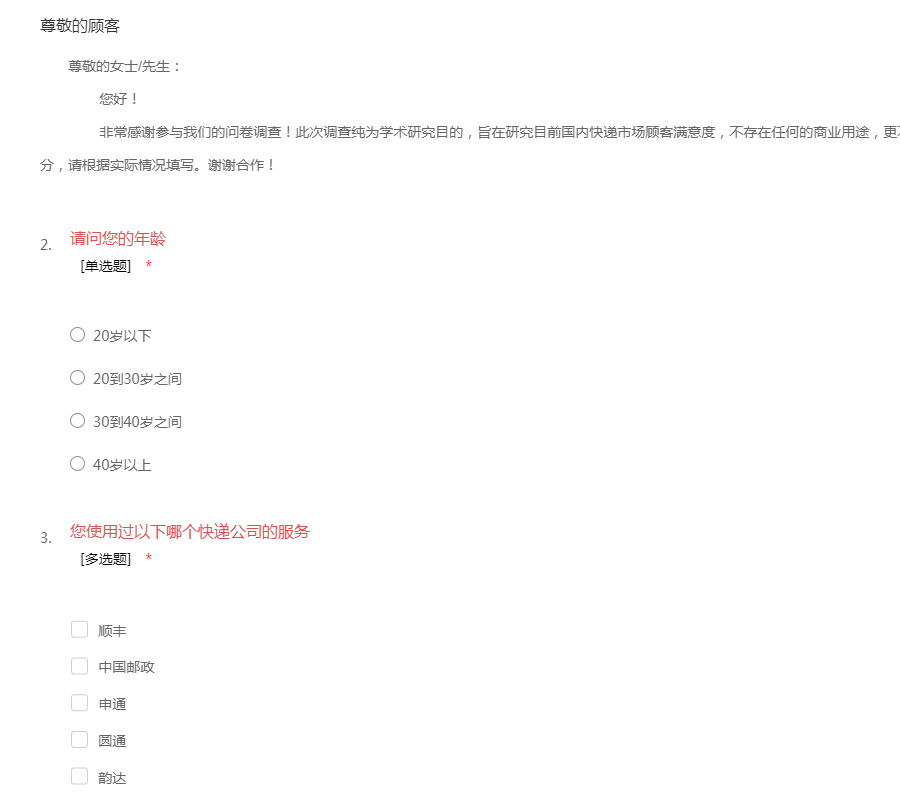 尊敬的女士/先生: 您好! 非常感谢参与我们的问卷调查!此次调查纯为学术研究目的,旨在研究目前国内快递市场顾客满意度,不存在任何的商业用途,更不会泄露您的任何隐私。回答无对错之分,请根据实际情况填写。谢谢合作!