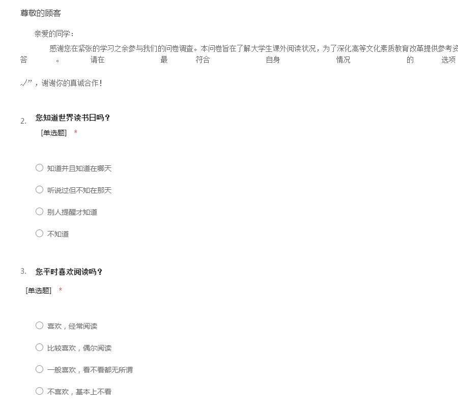 亲爱的同学: 感谢您在紧张的学习之余参与我们的问卷调查。本问卷旨在了解大学生课外阅读状况,为了深化高等文化素质教育改革提供参考资料,各项文题无对错优劣之分,请放心填答。请在最符合自身情况的选项上打“√”,谢谢你的真诚合作!