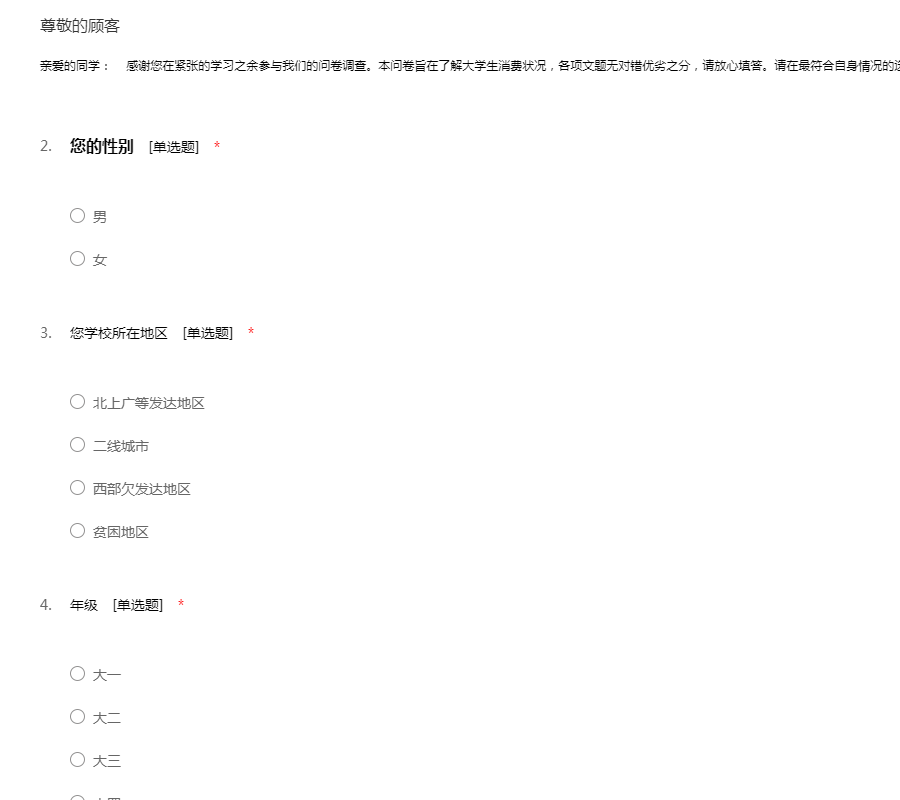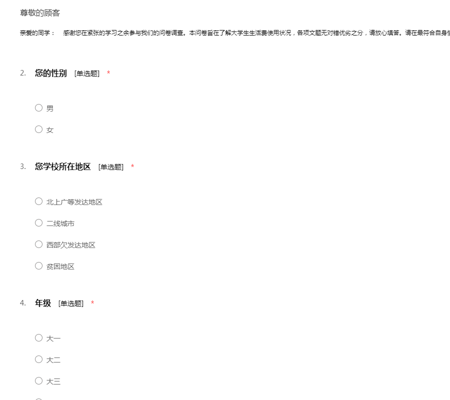 为了进一步了解我们当代大学生对消费观的认识,我们特别制定了这份调查问卷,以此来让当代大学生更清楚的认识自己,敬请您回答以下问题。
