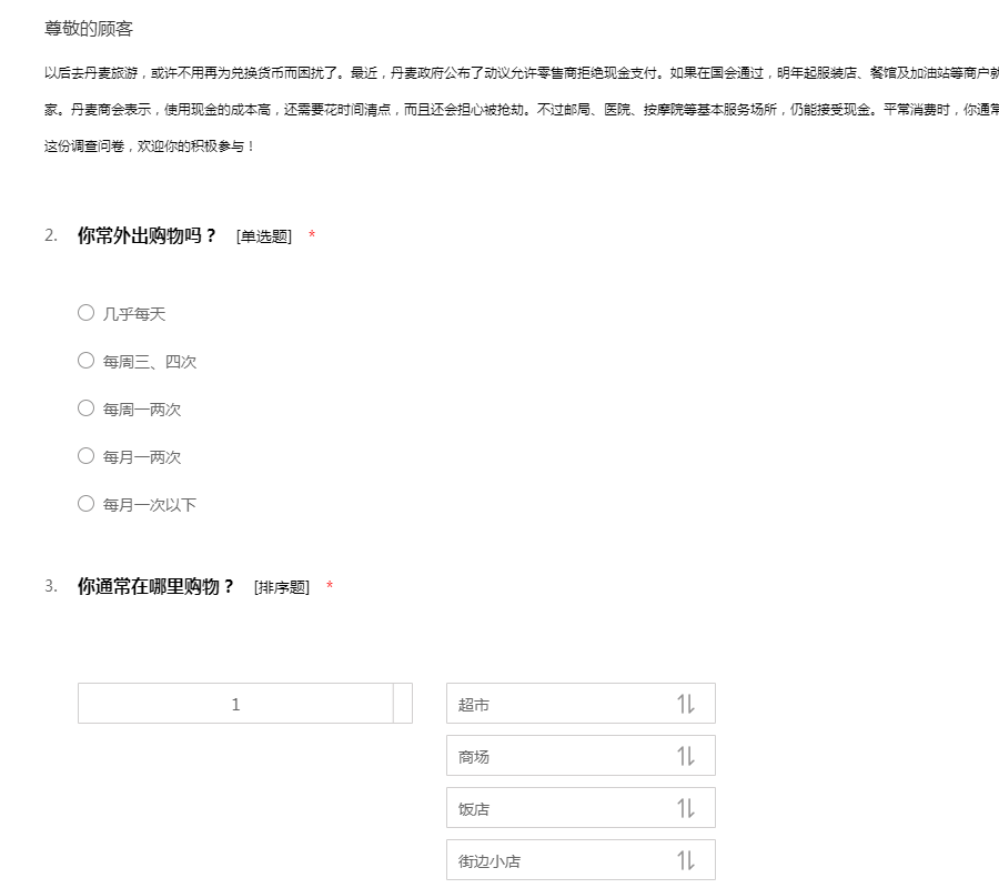 以后去丹麦旅游,或许不用再为兑换货币而困扰了。最近,丹麦政府公布了动议允许零售商拒绝现金支付。如果在国会通过,明年起服装店、餐馆及加油站等商户就可以拒绝接受现金,丹麦将成全球首个无现金国家。丹麦商会表示,使用现金的成本高,还需要花时间清点,而且还会担心被抢劫。不过邮局、医院、按摩院等基本服务场所,仍能接受现金。平常消费时,你通常使用怎样的支付方式呢?在此,我们特别设计了这份调查问卷,欢迎你的积极参与!