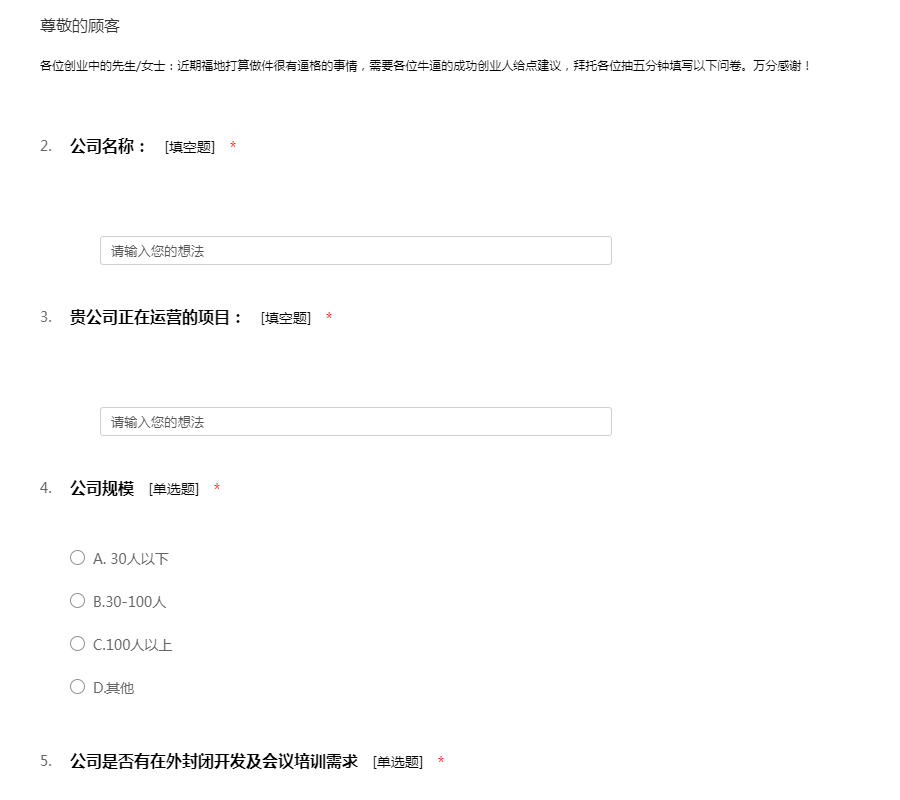 各位创业中的先生/女士:近期福地打算做件很有逼格的事情,需要各位牛逼的成功创业人给点建议,拜托各位抽五分钟填写以下问卷。万分感谢!
