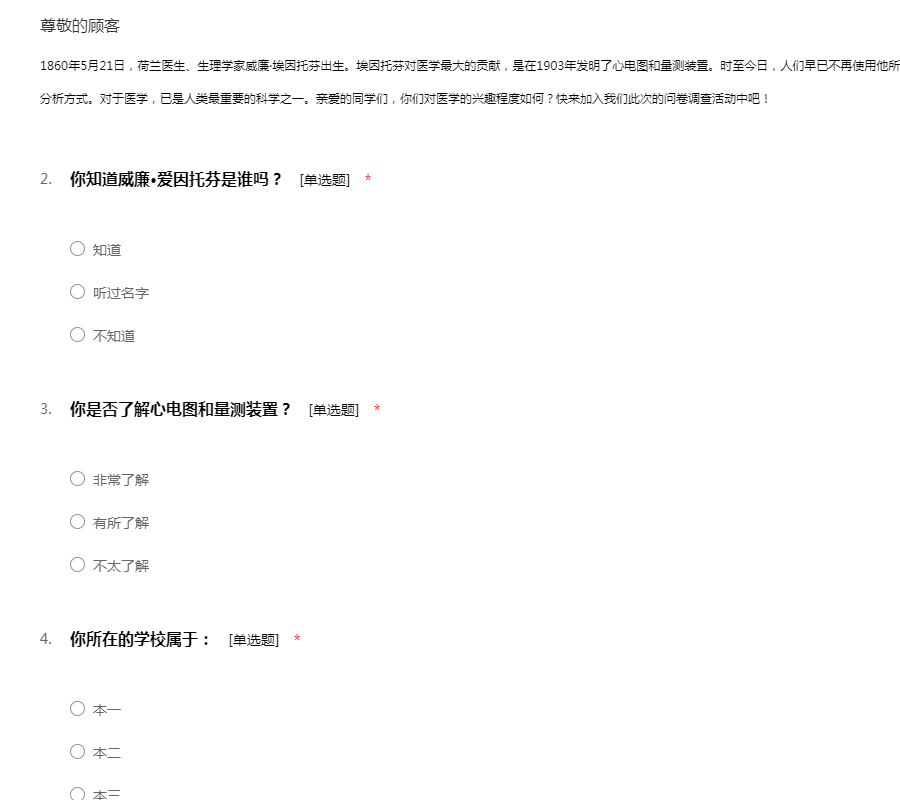 1860年5月21日,荷兰医生、生理学家威廉·埃因托芬出生。埃因托芬对医学最大的贡献,是在1903年发明了心电图和量测装置。时至今日,人们早已不再使用他所发明的装置,但扔在使用他发明的心电图解读和分析方式。对于医学,已是人类最重要的科学之一。亲爱的同学们,你们对医学的兴趣程度如何?快来加入我们此次的问卷调查活动中吧!