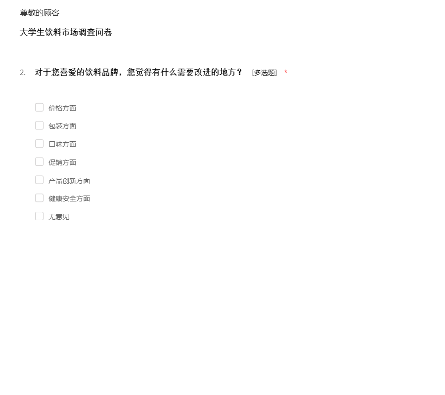 众里寻他千百度,蓦然回首,那人却在灯火阑珊处 非常感谢您在百忙之中做我们的调查问卷。我们是在做一个有关大学生饮料品牌选择的调查问卷,您的意见对我们的调查开展起着很重要的作用。此问卷不涉及个人隐私,您的意见将会被严格保密。希望你如实填写,感谢您的配合!