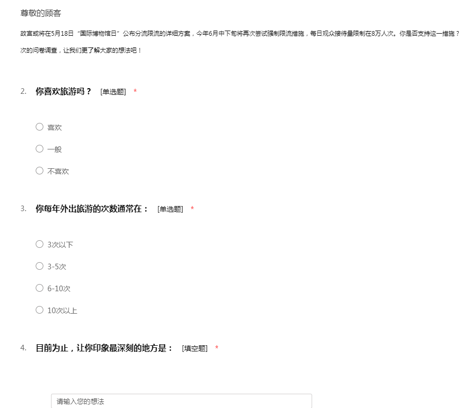 故宫或将在5月18日“国际博物馆日”公布分流限流的详细方案,今年6月中下旬将再次尝试强制限流措施,每日观众接待量限制在8万人次。你是否支持这一措施?你觉得如何减缓客流量比较好?快来参与我们此次的问卷调查,让我们更了解大家的想法吧!