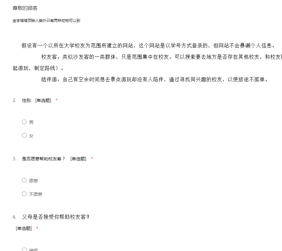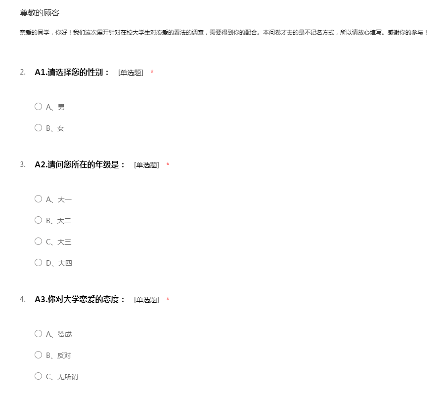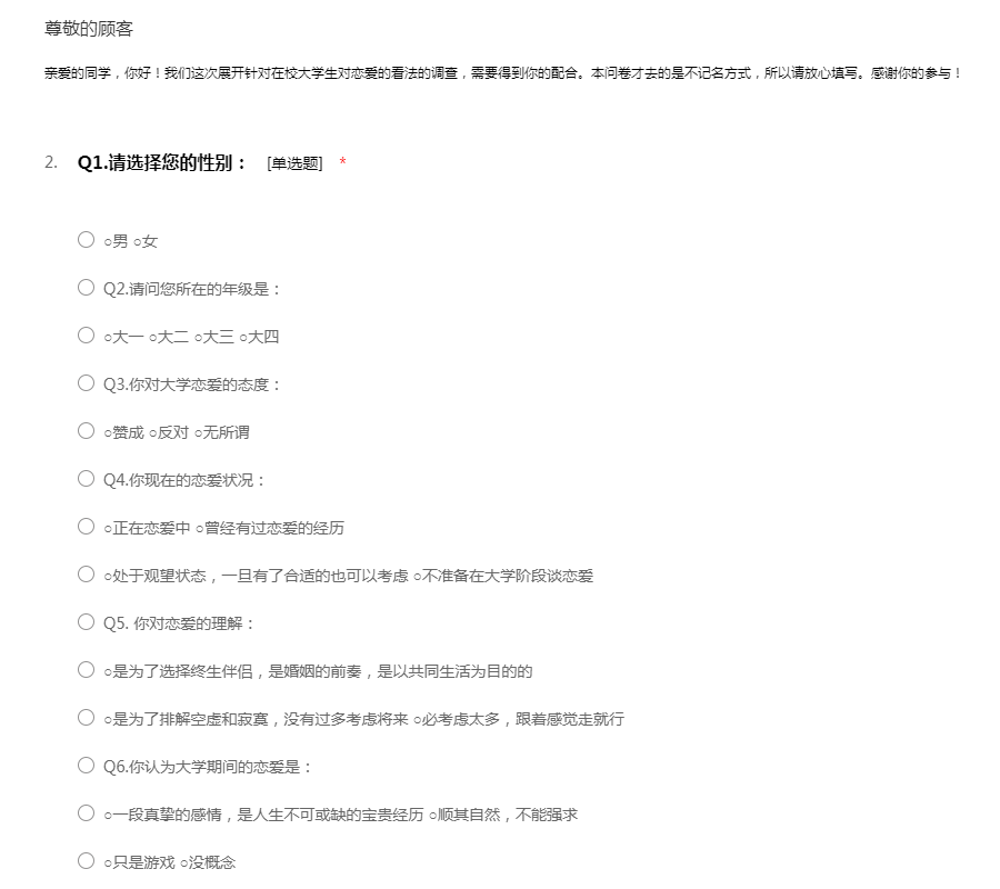 亲爱的同学,你好!我们这次展开针对在校大学生对恋爱的看法的调查,需要得到你的配合。本问卷才去的是不记名方式,所以请放心填写。感谢你的参与!