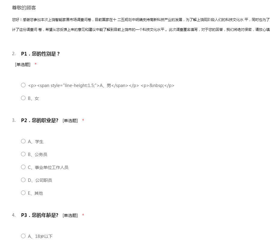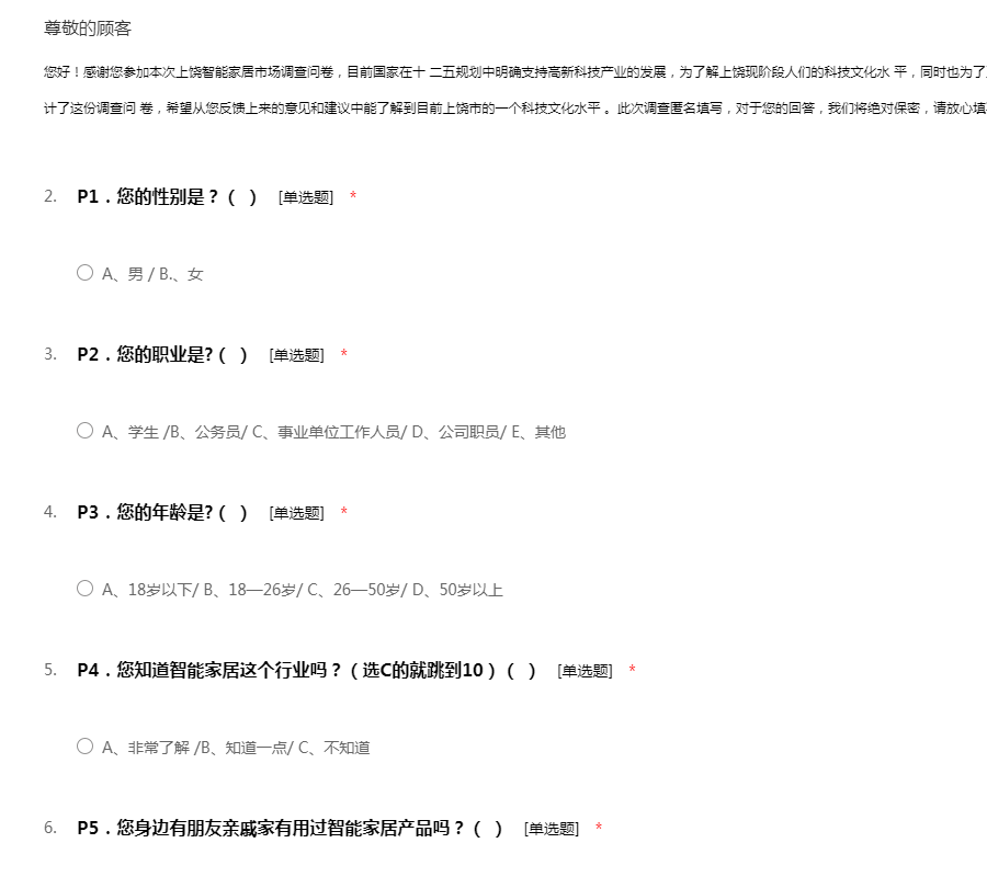 您好!感谢您参加本次上饶智能家居市场调查问卷,目前国家在十 二五规划中明确支持高新科技产业的发展,为了解上饶现阶段人们的科技文化水 平,同时也为了更好的促进我们上饶市整体经济的发展,我们设计了这份调查问 卷,希望从您反馈上来的意见和建议中能了解到目前上饶市的一个科技文化水平 。此次调查匿名填写,对于您的回答,我们将绝对保密,请放心填写!谢谢您的 合作!