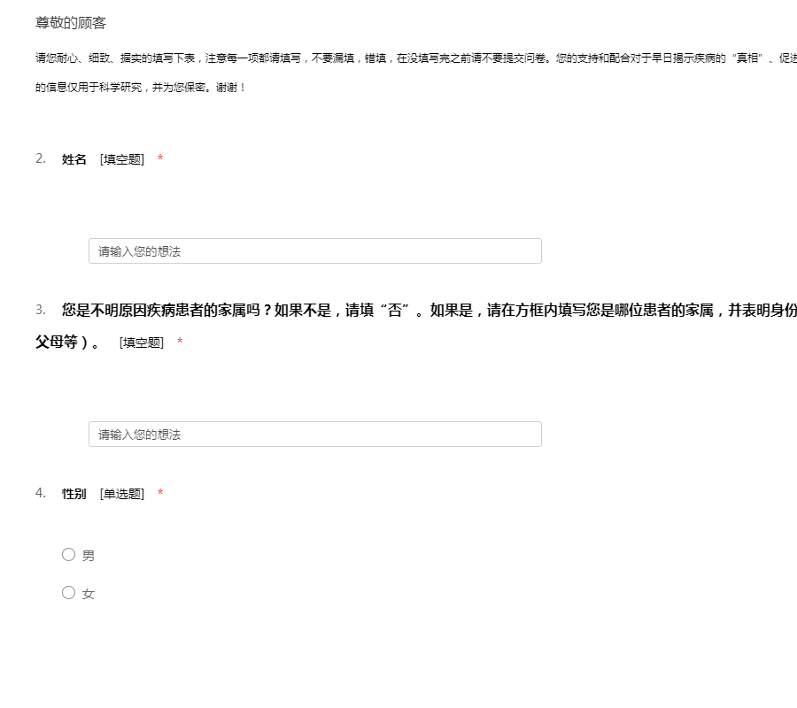 请您耐心、细致、据实的填写下表,注意每一项都请填写,不要漏填,错填,在没填写完之前请不要提交问卷。您的支持和配合对于早日揭示疾病的“真相”、促进相关人群的健康有重要意义,我们保证您所提供的信息仅用于科学研究,并为您保密。谢谢!
