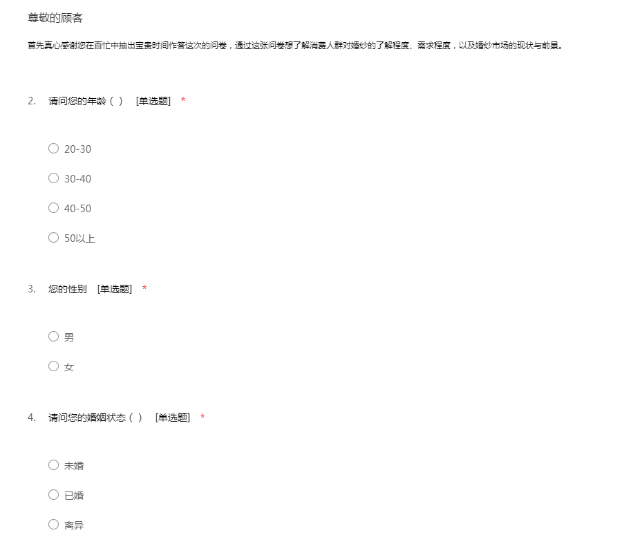 首先真心感谢您在百忙中抽出宝贵时间作答这次的问卷,通过这张问卷想了解消费人群对婚纱的了解程度、需求程度,以及婚纱市场的现状与前景。