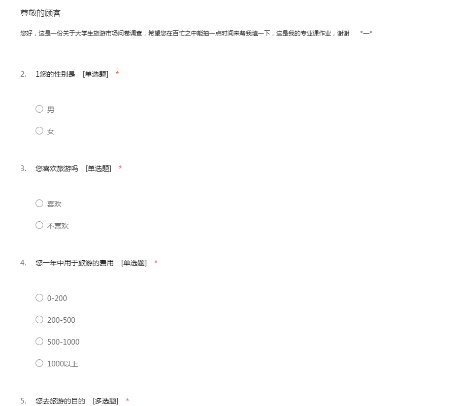 您好,这是一份关于大学生旅游市场问卷调查,希望您在百忙之中能抽一点时间来帮我填一下,这是我的专业课作业,谢谢 *—*