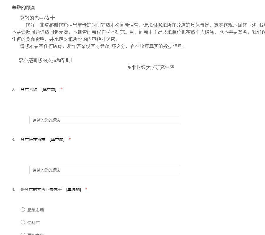 您好!非常感谢您能抽出宝贵的时间完成本次问卷调查。请您根据您所在分店的具体情况,真实客观地回答下述问题。请尽量按要求回答所有的问题,不要遗漏问题造成问卷无效。本调查问卷仅作学术研究之用,问卷中不涉及您单位机密或个人隐私,也不需要署名。我们保证本问卷不会对您和您所在分店有任何的负面影响,并承诺对您所说的内容绝对保密。