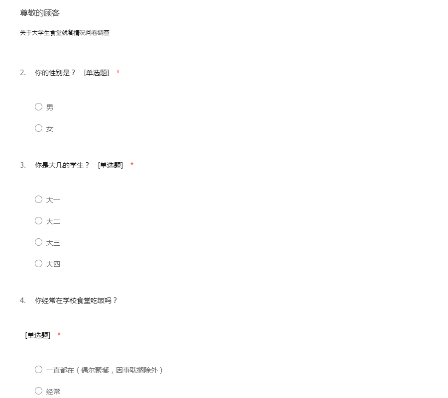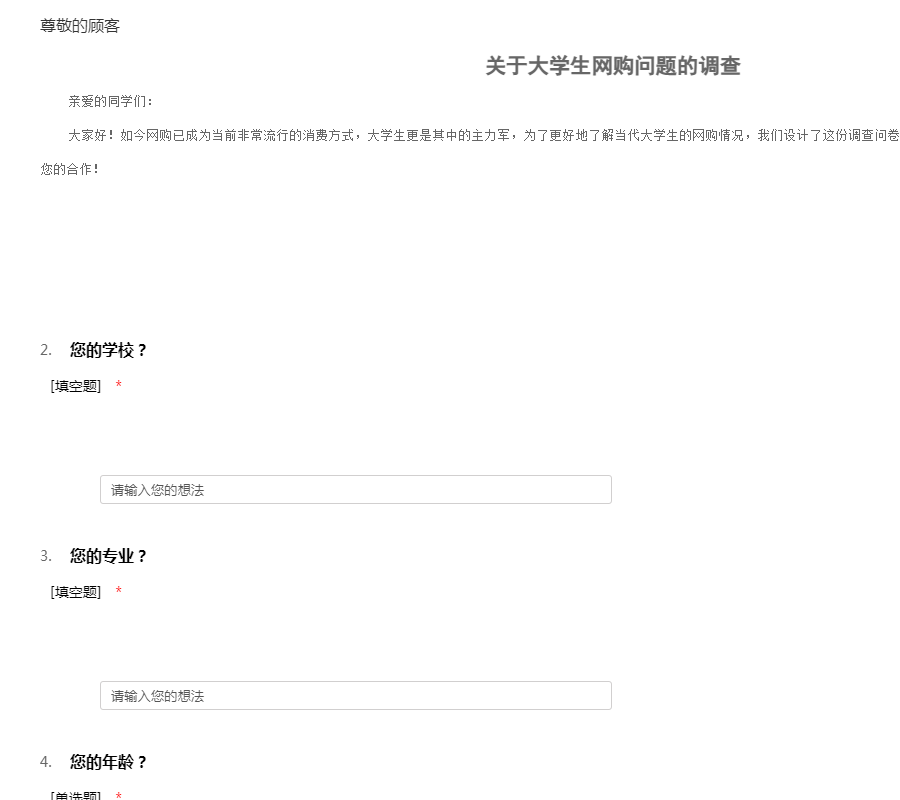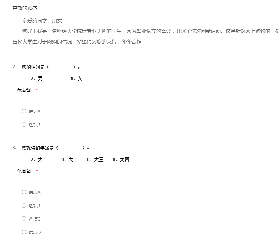 亲爱的同学、朋友: 您好!我是一名财经大学统计专业大四的学生,因为毕业论文的需要,开展了这次问卷活动。这是针对网上购物的一份调查问卷,调查的目的是为了了解当代大学生对于网购的情况,希望得到您的支持,谢谢合作!