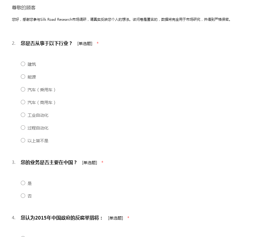 您好,感谢您参与Silk Road Research市场调研,请真实反映您个人的想法。该问卷是匿名的,数据将完全用于市场研究,并得到严格保密。
