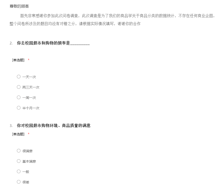 首先非常感谢你参加此次问卷调查,此次调查是为了我们的商品学关于商品分类的数据统计,不存在任何商业企图,更不会泄漏你的隐私,请放心填写。整个问卷所涉及的题目均没有对错之分,请根据实际情况填写,谢谢你的合作