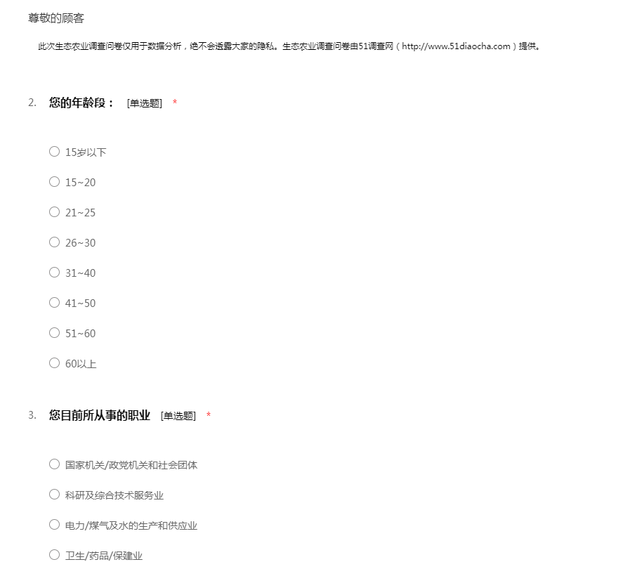 此次生态农业调查问卷仅用于数据分析,绝不会透露大家的隐私。生态农业调查问卷由51调查网(http://www.51diaocha.com)提供。