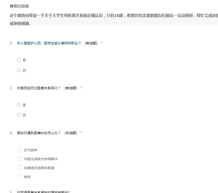 这个调查问卷是一个关于大学生对医患关系的正确认识,只有16题,希望各位亲爱的朋友们抽出一点点时间,帮忙完成这份问卷,在此对所有帮助的人表达最诚挚的感激。