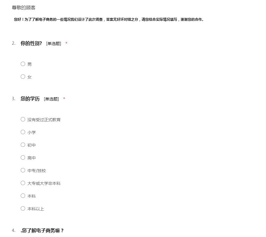 您好!为了了解电子商务的一些情况我们设计了此次调查,答案无好坏对错之分,请您结合实际情况填写,谢谢您的合作。