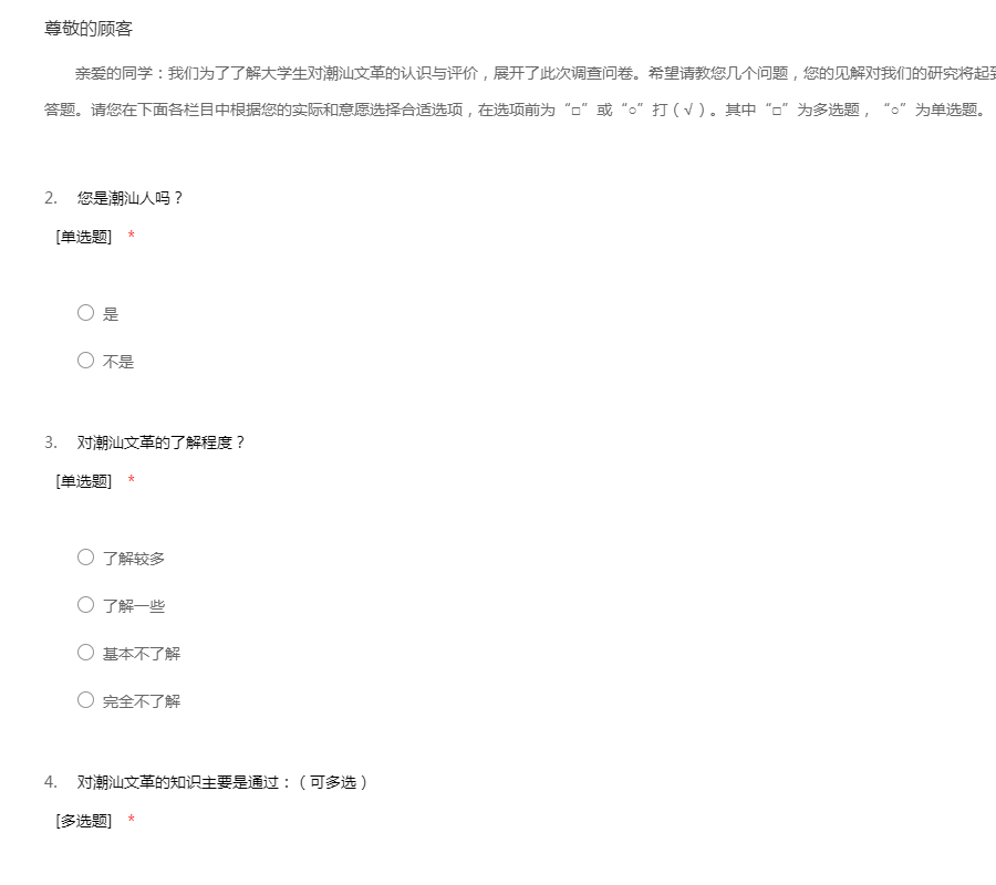 亲爱的同学:我们为了了解大学生对潮汕文革的认识与评价,展开了此次调查问卷。希望请教您几个问题,您的见解对我们的研究将起到积极的作用,感谢您参与此次调查问卷答题。请您在下面各栏目中根据您的实际和意愿选择合适选项,在选项前为“□”或“○”打(√)。其中“□”为多选题,“○”为单选题。
