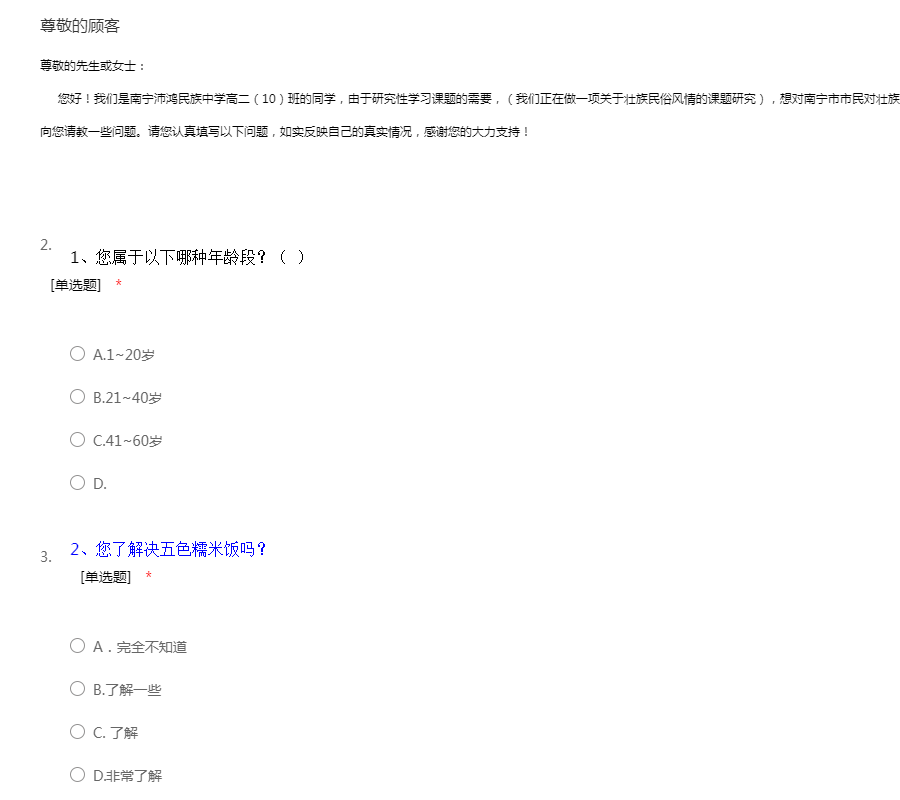 尊敬的先生或女士: 您好!我们是南宁沛鸿民族中学高二(10)班的同学,由于研究性学习课题的需要,(我们正在做一项关于壮族民俗风情的课题研究),想对南宁市市民对壮族传统美食五色糯米饭的了解做一些调查,在此想向您请教一些问题。请您认真填写以下问题,如实反映自己的真实情况,感谢您的大力支持!