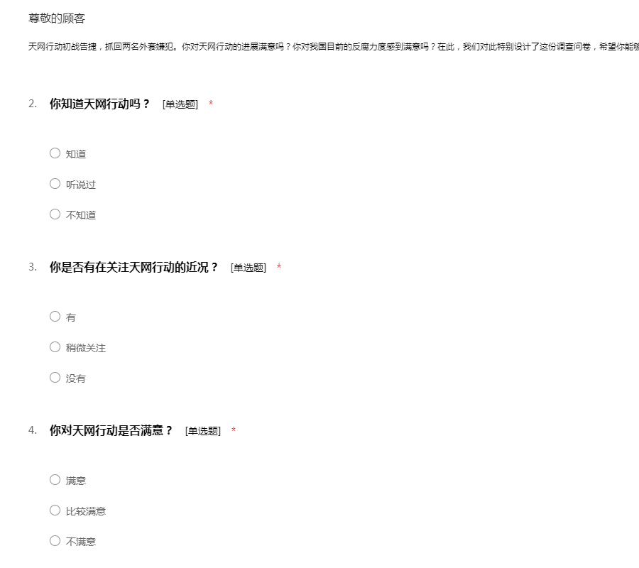天网行动初战告捷,抓回两名外套嫌犯。你对天网行动的进展满意吗?你对我国目前的反腐力度感到满意吗?在此,我们对此特别设计了这份调查问卷,希望你能够积极参与!问卷不记名,请不必有所顾虑。