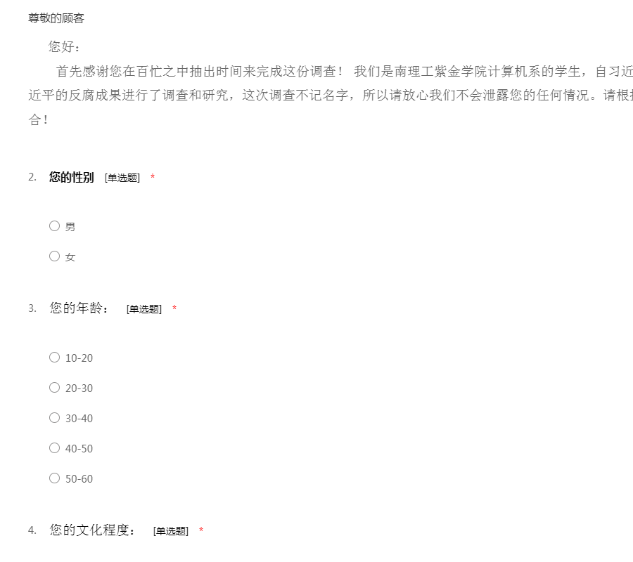 您好: 首先感谢您在百忙之中抽出时间来完成这份调查! 我们是南理工紫金学院计算机系的学生,自习近平当选国家主席后,我们对习近平的反腐成果进行了调查和研究,这次调查不记名字,所以请放心我们不会泄露您的任何情况。请根据实际情况回答,谢谢您的配合!