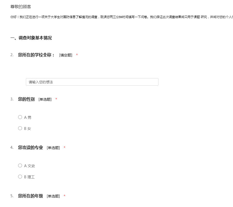 你好!我们正在进行一项关于大学生对国防信息了解情况的调查,耽误您两三分钟时间填写一下问卷。我们保证此次调查结果将只用于课题 研究,并将对您的个人信息完全保密,非常感谢您对我们工作的支持!
