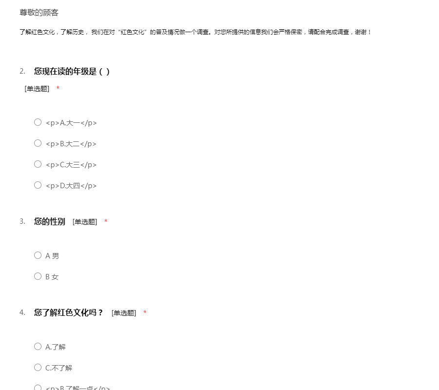 了解红色文化,了解历史, 我们在对“红色文化”的普及情况做一个调查。对您所提供的信息我们会严格保密,请配合完成调查,谢谢!