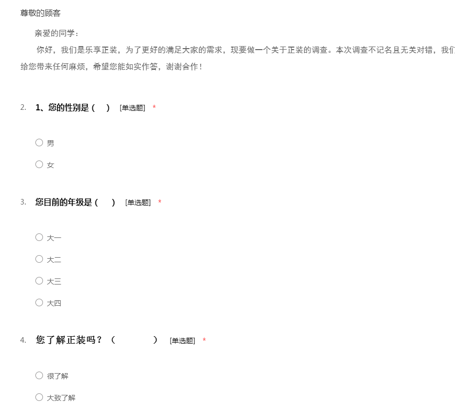 亲爱的同学: 你好,我们是乐享正装,为了更好的满足大家的需求,现要做一个关于正装的调查。本次调查不记名且无关对错,我们将对您的答案进行严格保密,不会给您带来任何麻烦,希望您能如实作答,谢谢合作!