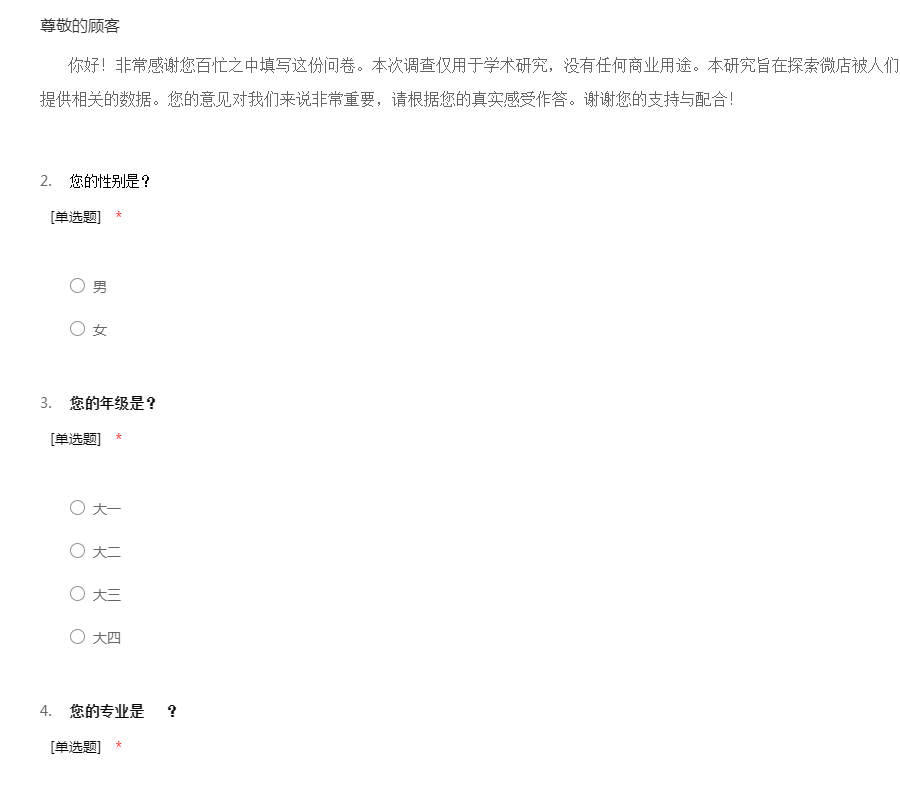 你好!非常感谢您百忙之中填写这份问卷。本次调查仅用于学术研究,没有任何商业用途。本研究旨在探索微店被人们熟识程度及消费心理,为微店的研究提供相关的数据。您的意见对我们来说非常重要,请根据您的真实感受作答。谢谢您的支持与配合!