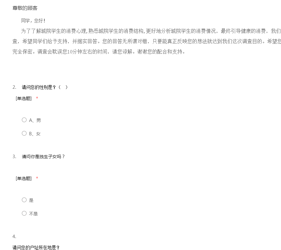 同学,您好! 为了了解城院学生的消费心理,熟悉城院学生的消费结构,更好地分析城院学生的消费情况,最终引导健康的消费,我们准备开展这次大学生消费情况的调查,希望同学们给予支持,并据实回答。您的回答无所谓对错,只要能真正反映您的想法就达到我们这次调查目的。希望您能够积极参与,我们将对您的回答完全保密。调查会耽误您10分钟左右的时间,请您谅解。谢谢您的配合和支持。