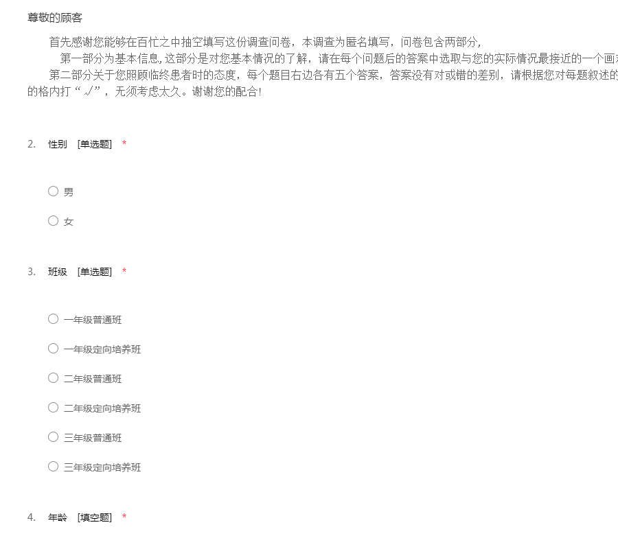 首先感谢您能够在百忙之中抽空填写这份调查问卷,本调查为匿名填写,问卷包含两部分, 第一部分为基本信息,这部分是对您基本情况的了解,请在每个问题后的答案中选取与您的实际情况最接近的一个画对号“√”或在相应的空格上填写。 第二部分关于您照顾临终患者时的态度,每个题目右边各有五个答案,答案没有对或错的差别,请根据您对每题叙述的同意或不同意程度,快速的在适合的格内打“√”,无须考虑太久。谢谢您的配合!
