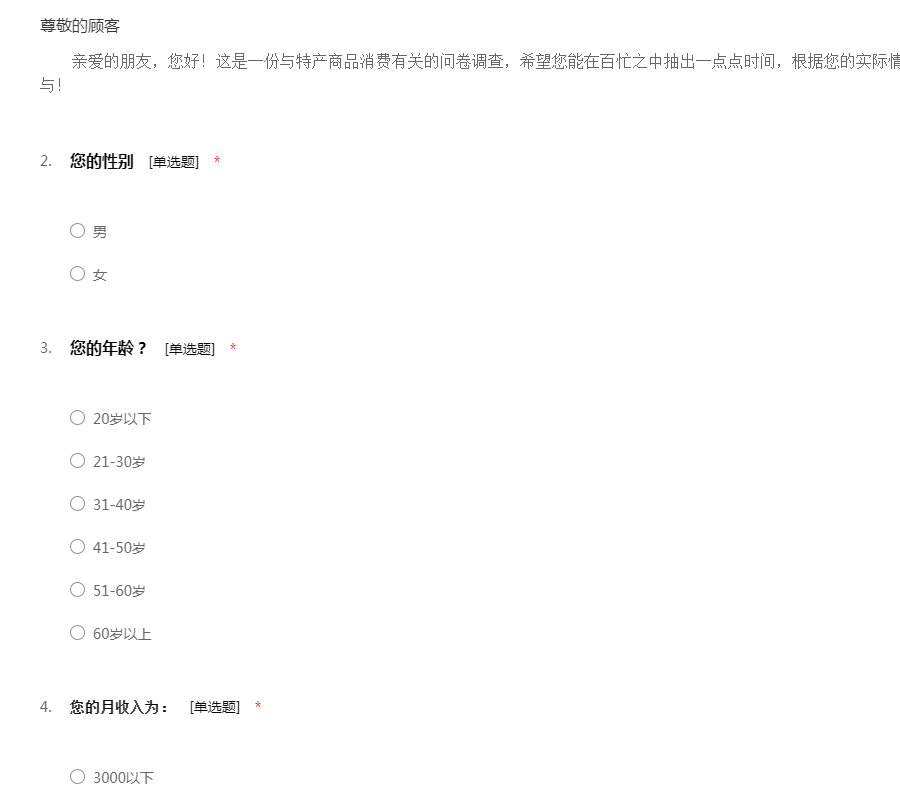 亲爱的朋友,您好!这是一份与特产商品消费有关的问卷调查,希望您能在百忙之中抽出一点点时间,根据您的实际情况进行填写,非常感谢您的热情参与!