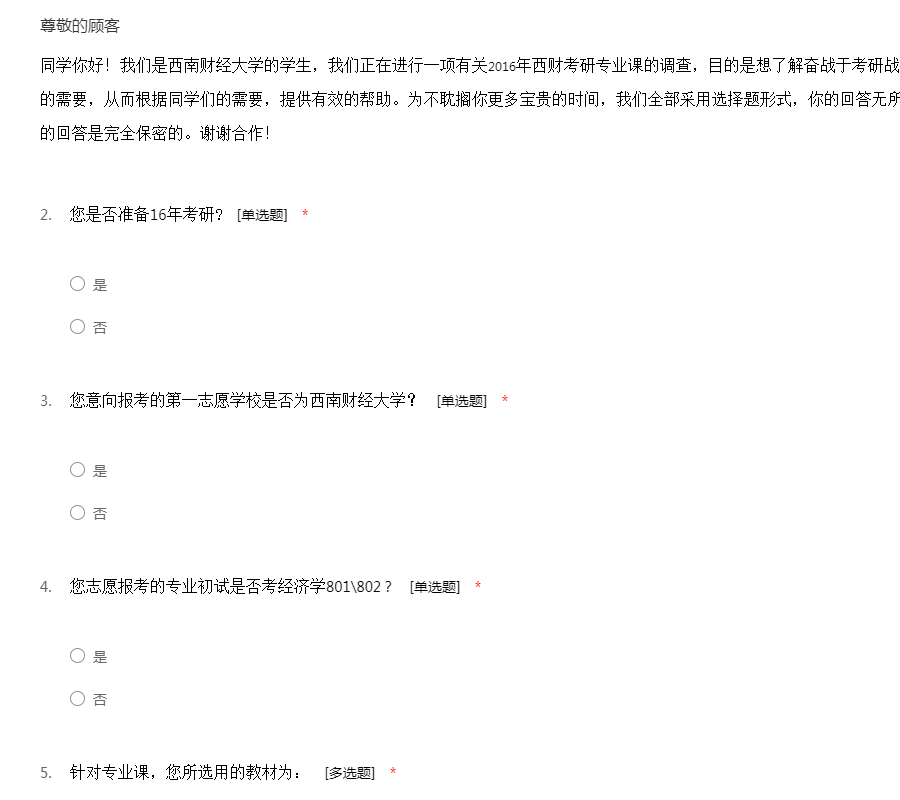 同学你好!我们是西南财经大学的学生,我们正在进行一项有关2016年西财考研专业课的调查,目的是想了解奋战于考研战线上的同学们对于专业课学习过程中的需要,从而根据同学们的需要,提供有效的帮助。为不耽搁你更多宝贵的时间,我们全部采用选择题形式,你的回答无所谓对错,愿你如实填写,我们对你的回答是完全保密的。谢谢合作!