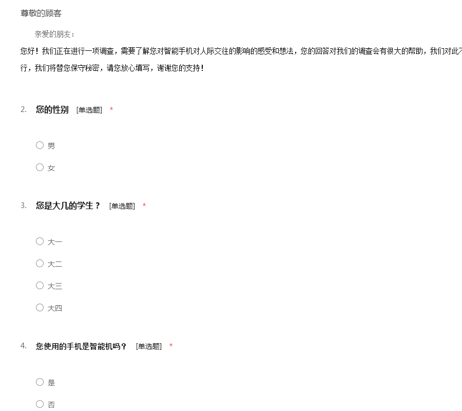亲爱的朋友: 您好!我们正在进行一项调查,需要了解您对智能手机对人际交往的影响的感受和想法,您的回答对我们的调查会有很大的帮助,我们对此不胜感激。本次问卷采用无记名的方式进行,我们将替您保守秘密,请您放心填写,谢谢您的支持!