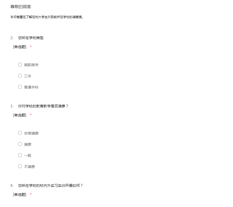本问卷重在了解在校大学生对目前所在学校的满意度。