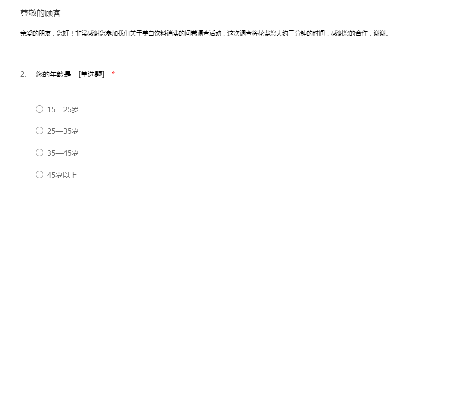 亲爱的朋友,您好!非常感谢您参加我们关于美白饮料消费的问卷调查活动,这次调查将花费您大约三分钟的时间,感谢您的合作,谢谢。