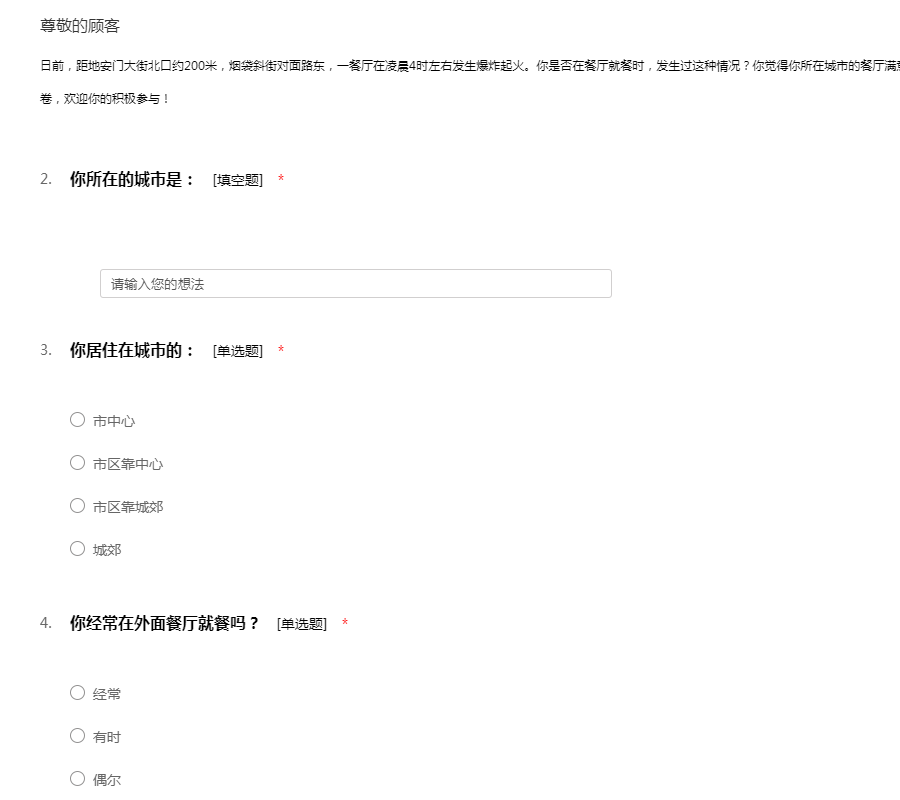日前,距地安门大街北口约200米,烟袋斜街对面路东,一餐厅在凌晨4时左右发生爆炸起火。你是否在餐厅就餐时,发生过这种情况?你觉得你所在城市的餐厅满意度如何?在此,我们特别设计了这份调查问卷,欢迎你的积极参与!