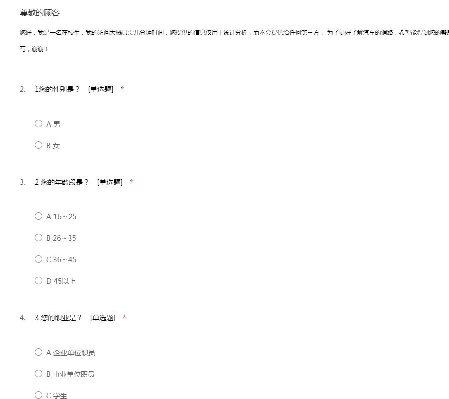 您好,我是一名在校生,我的访问大概只需几分钟时间,您提供的信息仅用于统计分析,而不会提供给任何第三方, 为了更好了解汽车的销路,希望能得到您的帮助与支持,您的意见对我们非常重要,请认真填写,谢谢!
